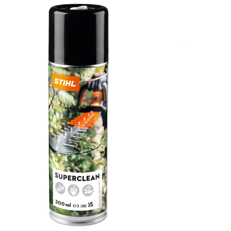 A STIHL Superclean spray eltávolítja a gyantát, rozsdát és egyéb szennyeződéseket a vágószerkezetekről, sövénynyíró késekről és a STIHL láncfűrészekről. A kettős hatású spray hatékonyan tisztít, emellett kenőanyagként és korrózióvédőként is használható. A vágóeszközök hosszabb élettartamának érdekében ajánlott a használat utáni ápolás a STIHL Superclean spray-vel. A sövénynyíró késeket a befúvás után rövid időre be kell indítani.